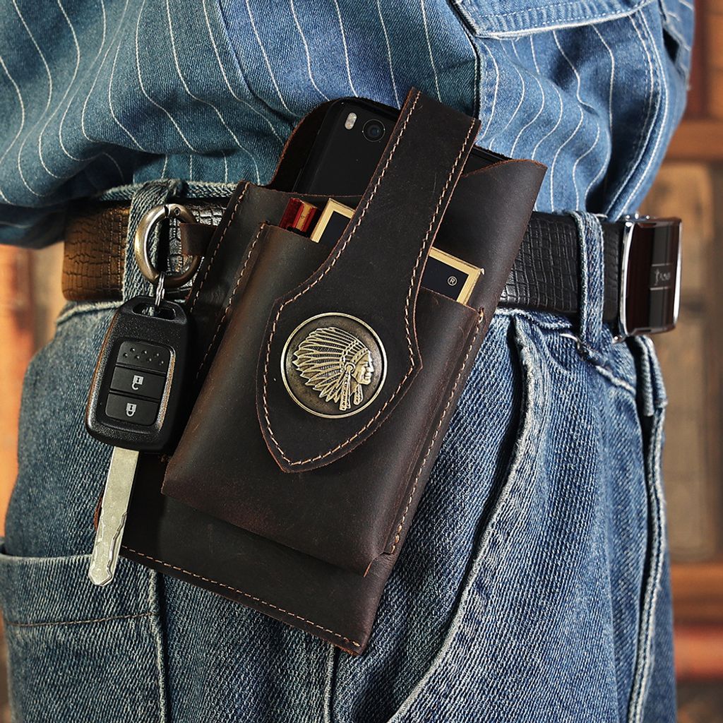 Bolsa de cintura para homem em pele genuína para telemóvel, criativa e exclusiva, fabricada em pele Crazy Horse, com grande capacidade, pode ser usada com cinto, bolsa de cintura tática.