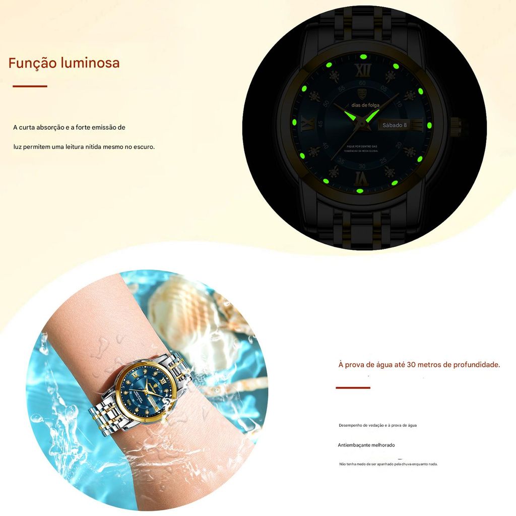 Novo Relógio de Senhora de Marca Suíça: À Prova de Água, Luminoso e com Calendário Duplo — Um Best-seller Transfronteiriço Viral (Dropshipping Disponível)